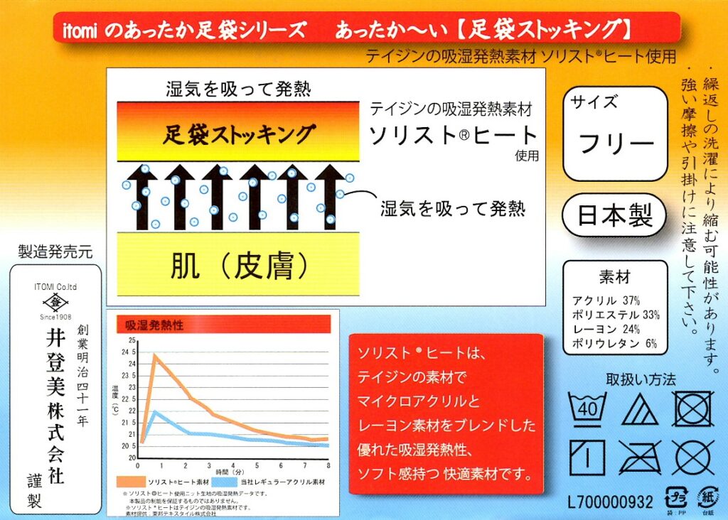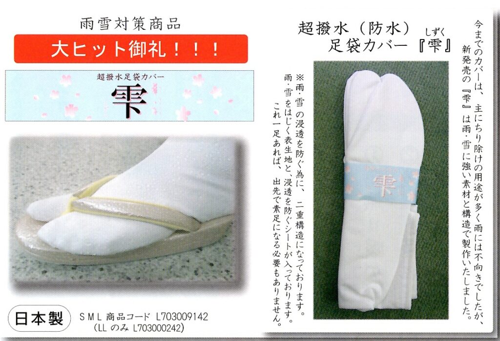 2026年1月10日 / 最終更新日時 : 2026年1月10日 いと善 和小物情報 「二十歳のつどい」にあったか〜い足袋ストッキング ◉足袋ストッキング2026.1.12「二十歳のつどい」は大寒波の予報。足元の防寒に「足袋ストッキング(井登美)」がお勧めです。吸湿発熱素材で足袋の内側に履くので、とってもあったか〜い! フリーサイズ 990円 (※1/10残り1点) EPSON MFP image EPSON MFP image ◉撥水足袋カバー 雨雪の防水や防寒に S 〜Mサイズ1,50円 L〜3Lサイズ1,760円 EPSON MFP image Follow me! FacebookXBluesky