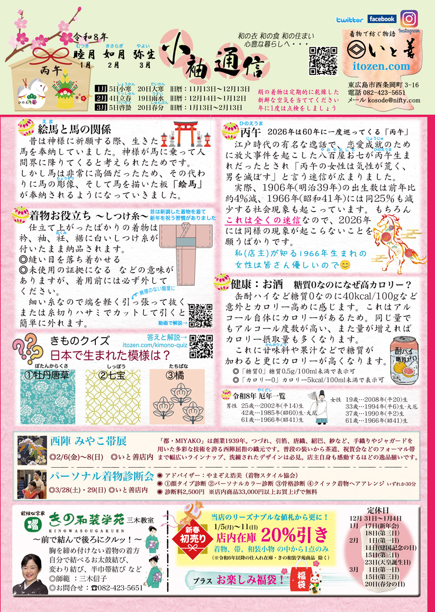 「和の衣 和の食 和の住まい 心豊かな暮らしへ・・・」 私たちが伝統的に受け継ぐ季節の話題や着物お役立ち情報を定期的にお届けしています。 1~3月号(令和8年) 10~12月号(令和7年) 7〜9月号(令和7年) 4〜6月号(令和7年) 1〜3月号(令和7年) 10〜12月号(令和6年) 7〜9月号(令和6年) 4〜6月号(令和6年) 1〜3月号(令和6年) 10〜12月号(令和5年) 7〜9月号(令和5年) 4〜6月号(令和5年) 1〜3月号(令和5年) 10〜12月号(令和4年) 7〜9月号(令和4年) 4〜6月号(令和4年) 1〜3月号(令和4年) FacebookXBluesky